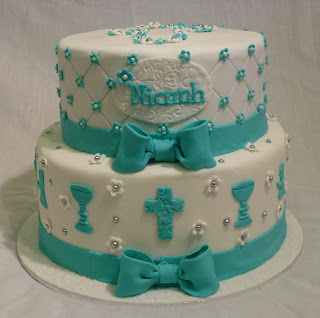 A cake to celebrate the First Communion of Niamh. The lower tier is Raspberry and White Chocolate mud Cake filled with white chocolate ganache. The second tier is Devils Food Cake (chocolate) filled with dark chocolate ganache.